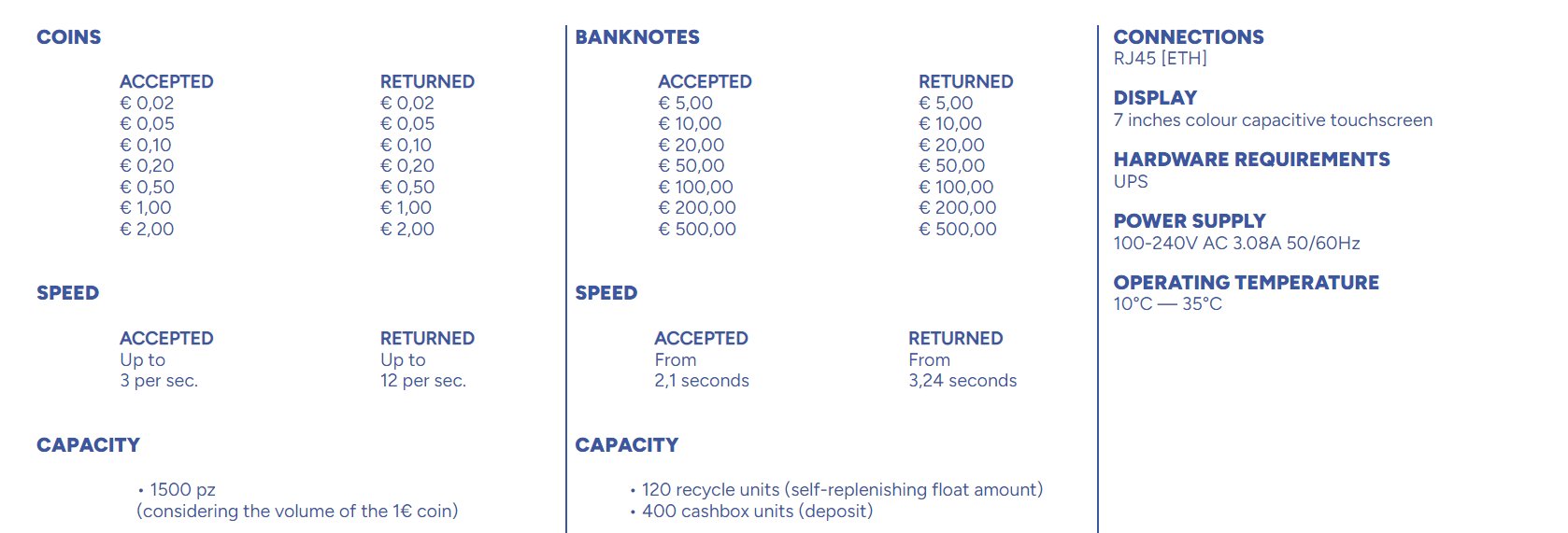 • Optimalizuje čas riadenia pokladničného miesta, automaticky vracia drobné a eliminuje všetky operácie počítania hotovosti spojené s otvorením a zatvorením pokladnice a so zmenou zmeny.