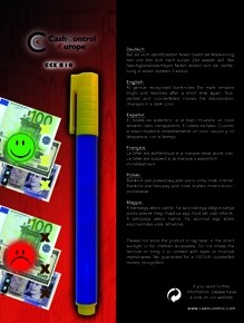 Pen tester CCE 810 je pero na chemickú detekciu falošných bankoviek. Jednoduché používanie. Požiteľné pre bankovky vyhotovené z vláknitého materiálu. Nevyhovuje pre plastové bankovky, napríklad austrálsky dolár Prenosné vo vreckovom formáte. Veľmi rýchly výsledok testovania Živosnosť cca 6.000 použití Nemusí rozpoznať veľmi kvalitné falzifikáty. Pre ubezpečenie sa o pravosti bankvky použite CCE 100, CCE 110 alebo CCE 112