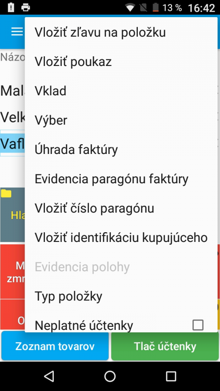 K zariadeniu je možné pripojiť pokladničnú zásuvku (6V), otváranie iba v prípade pripjenia na adaptér. Tak isto je možné pripojiť cez USB snímač čiarových kódov, prípadne váhu (len PREMIUM verzia aplikácie).