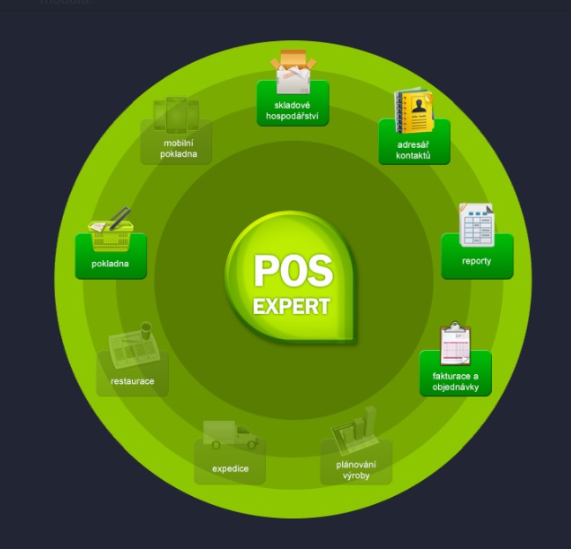 Maloobchodný systém POS Expert sa skladá z niekoľkých funkčných modulov, ktoré zaisťujú chod jednotlivých oblastí malobchodního predaja. Nasledujúca schéma zobrazuje jednotlivé dostupné moduly v systéme POS Expert pre maloobchod. Kliknutím na odkazy modly pod obrázkom sa presuniete k podrobnejšiemu opisu týchto modulov.